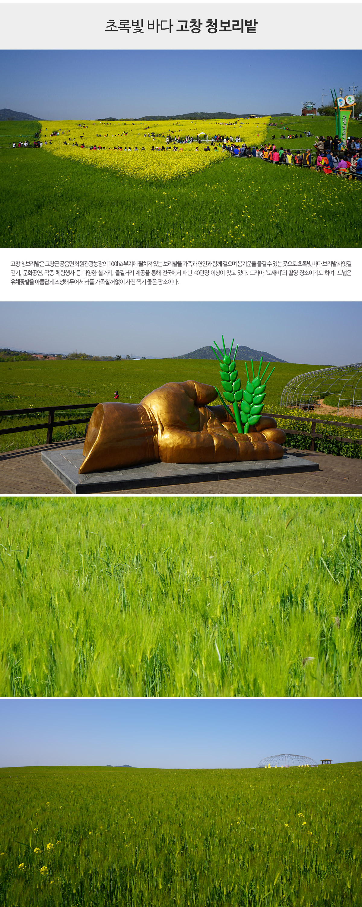 - 20만평의 끝없이 펼쳐지는 보리밭 사잇길을 걸으며, 싱그러운 추억을 남겨보세요.