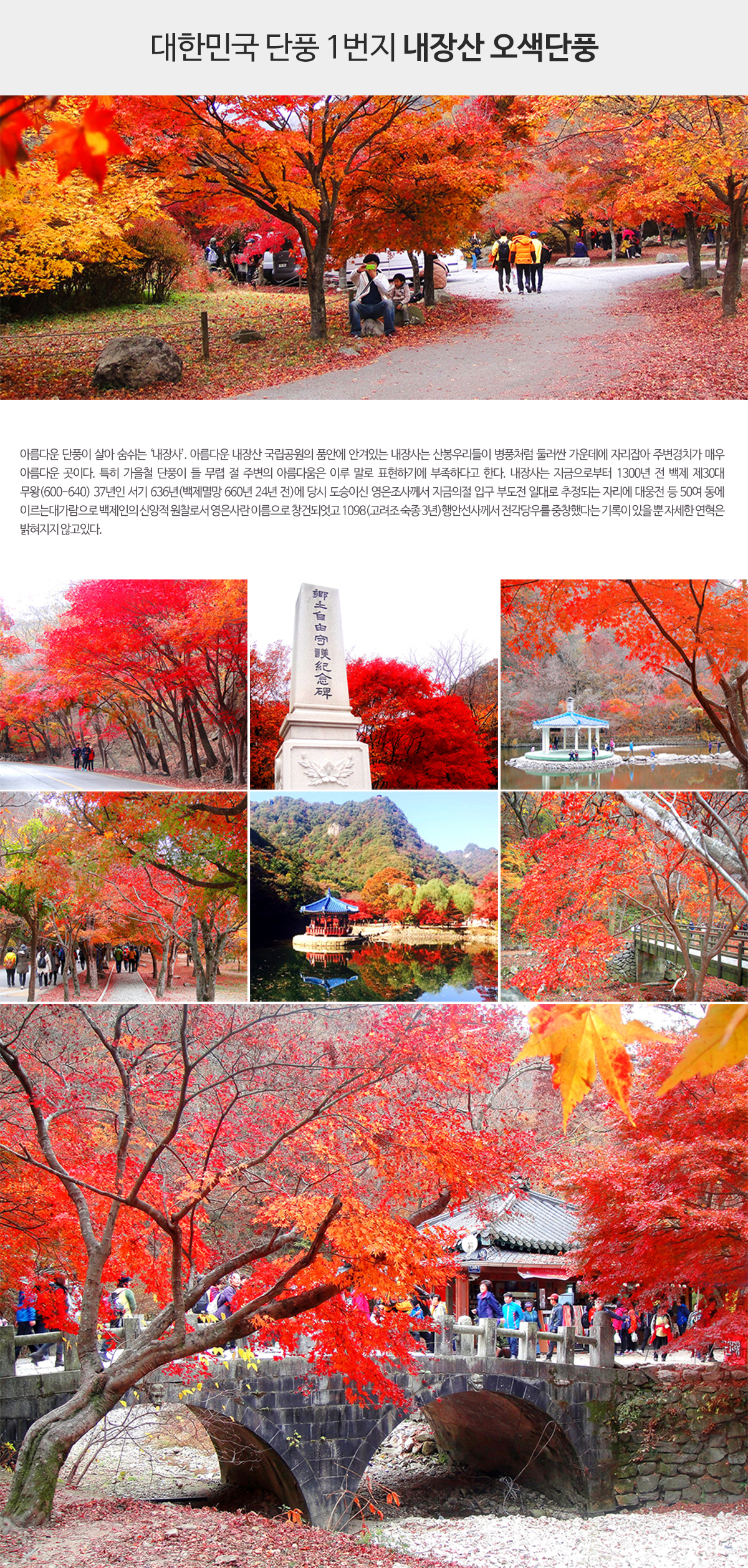 - [봄 백양 가을 내장] 이라는 말이 있을 정도로 절경을 자랑하는 내장산 단풍