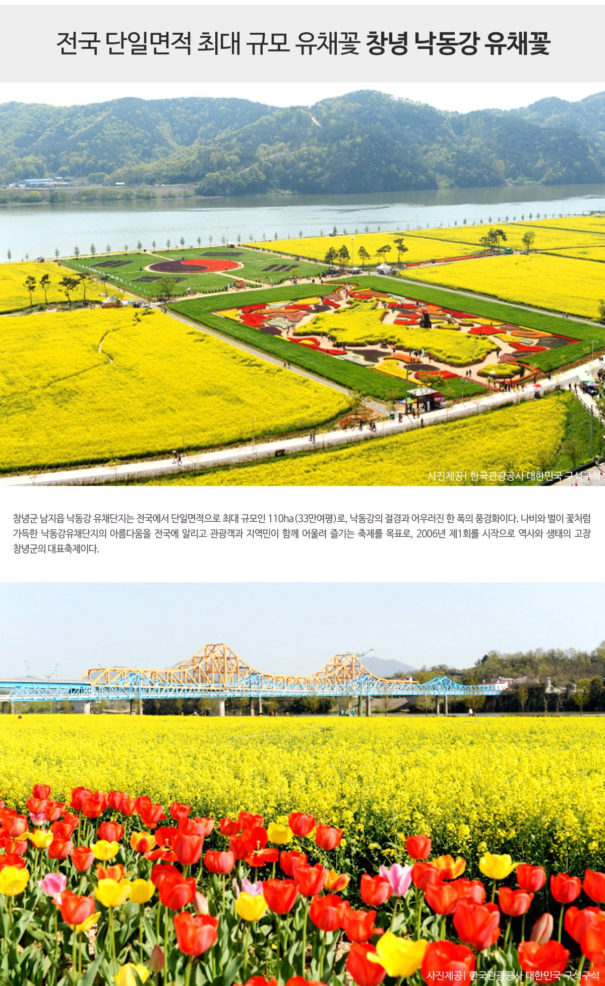 - 전국 단일면적 최대 규모 유채꽃이 어우러진 창녕 낙동강 유채꽃밭