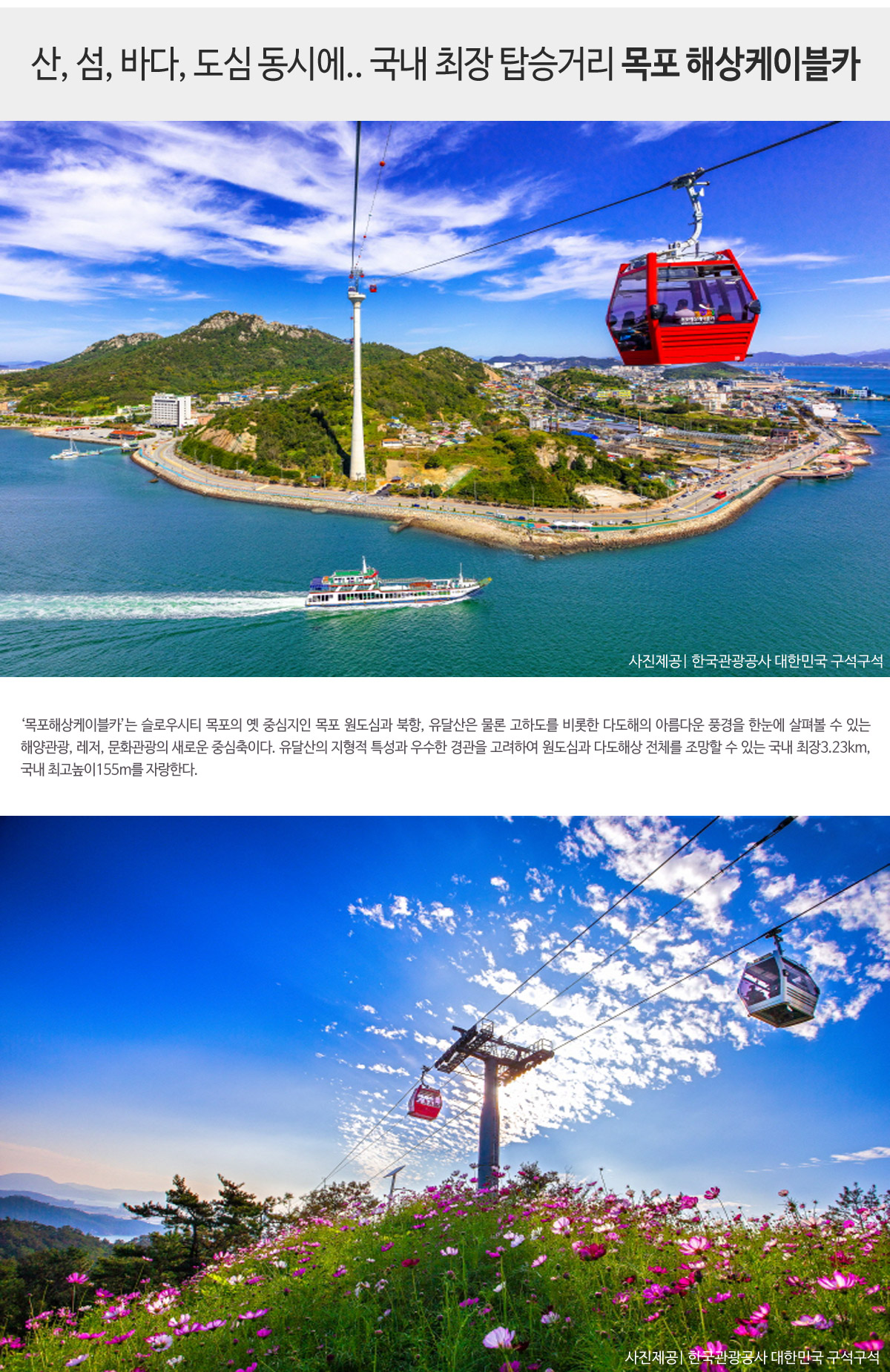 - 유달산 정상부에서 "ㄱ"자로 꺽여 해상을 지나 반달섬 고하도에 이르는 국내 최장 케이블카