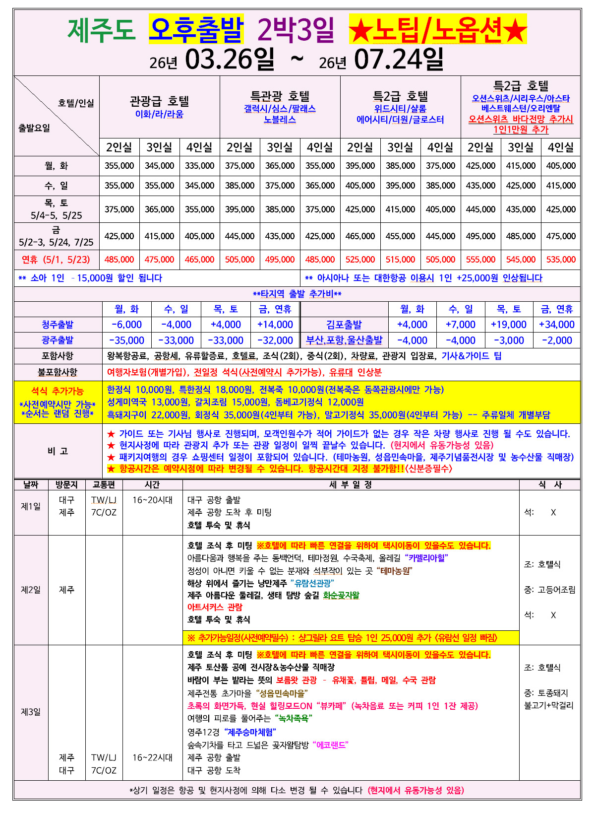 [오후출발] 제주도 2박3일 패키지 노팁/노옵션