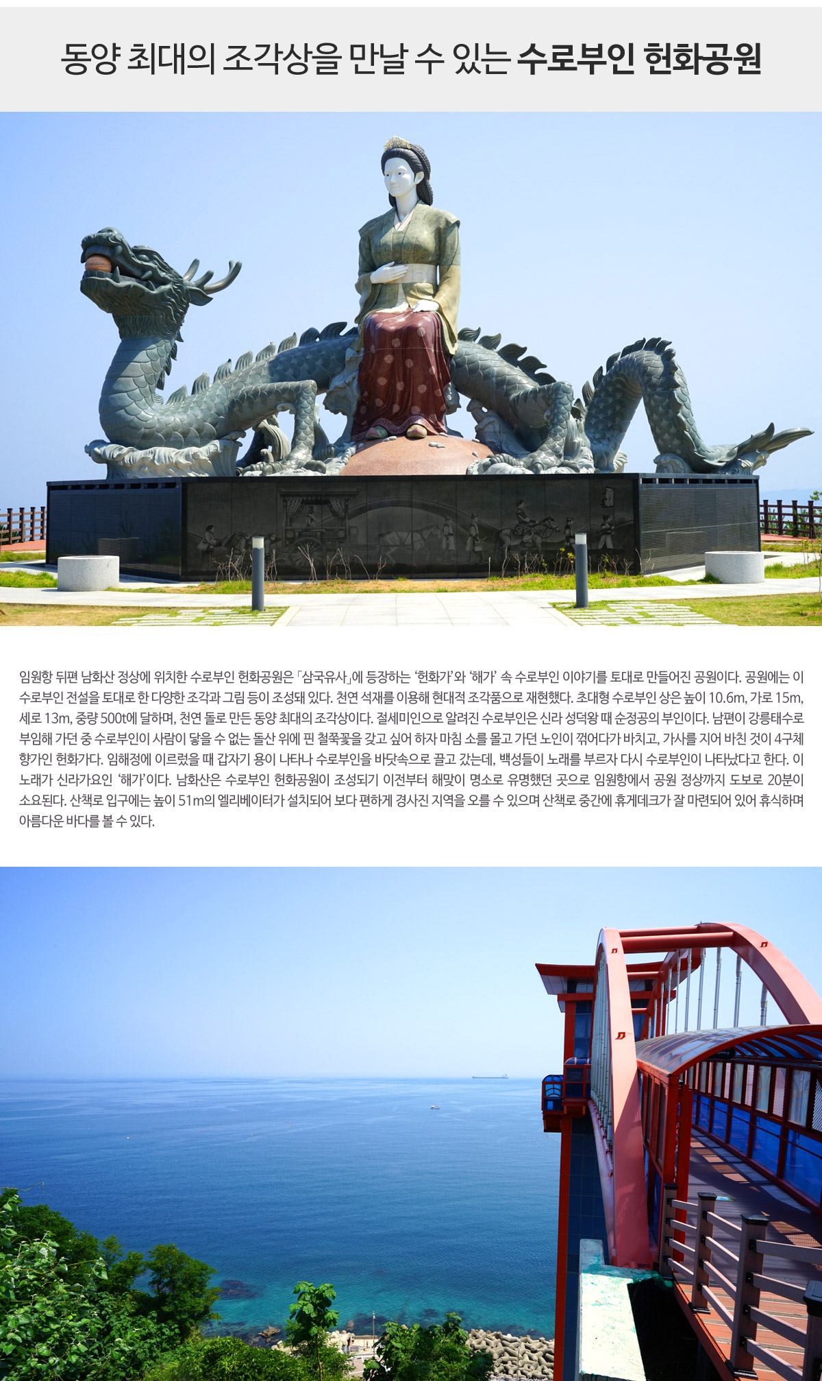 - 초대형 수로부인 상은 높이 10.6m, 가로 15m, 세로 13m, 중량 500t, 천연 돌로 만든 동양 최대의 조각상